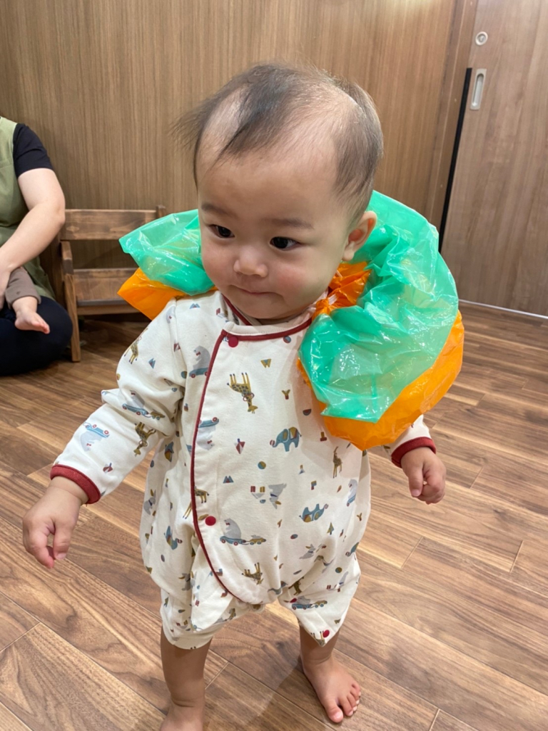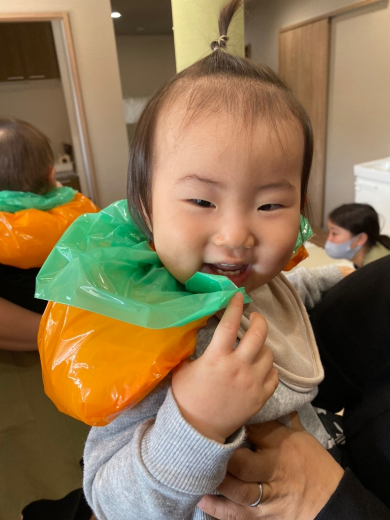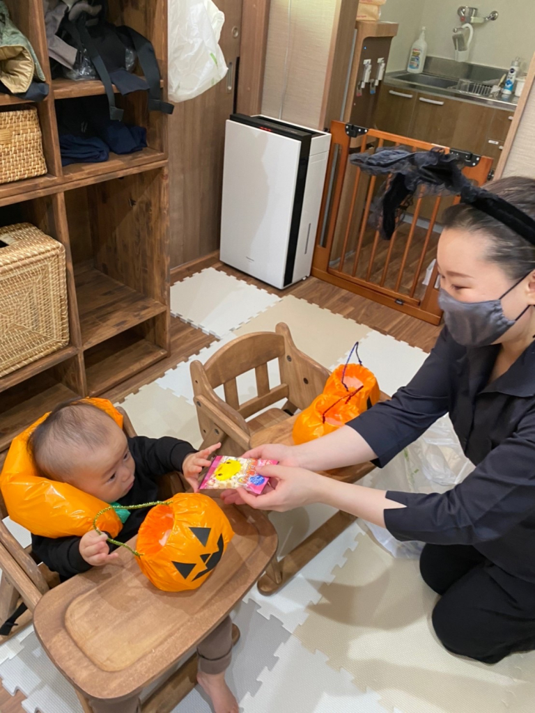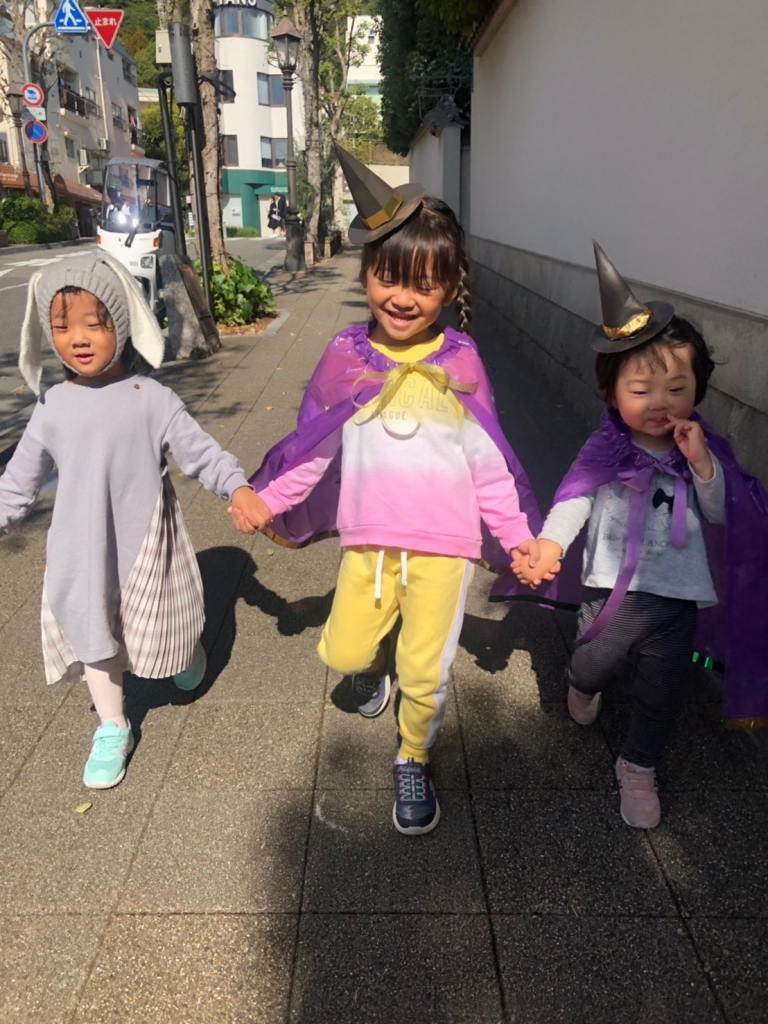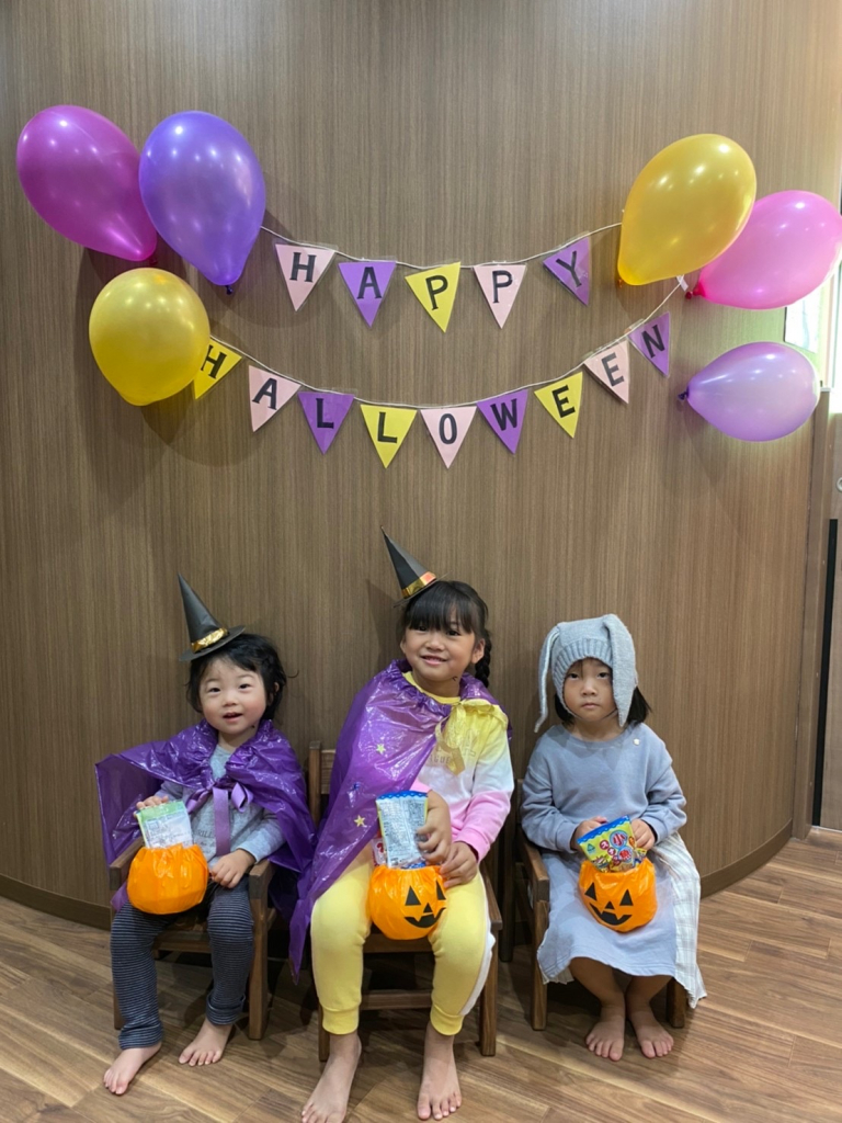ハロウィンの絵本を見たり、「トリックオアトリート」でお菓子を沢山もらったり